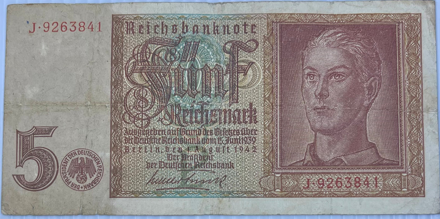 This authentic 1941 German 5 Reichsmark banknote (P-186) represents a significant piece of World War II monetary history. Issued during the Nazi regime, this circulated note features period-appropriate design elements and bears the marks of its time in circulation. The used condition adds to its historical authenticity, making it a compelling addition to any serious numismatic or historical collection. A tangible artifact from one of history's most pivotal eras, this banknote offers collectors direct connection to WWII-era Germany and the economic systems of the period.