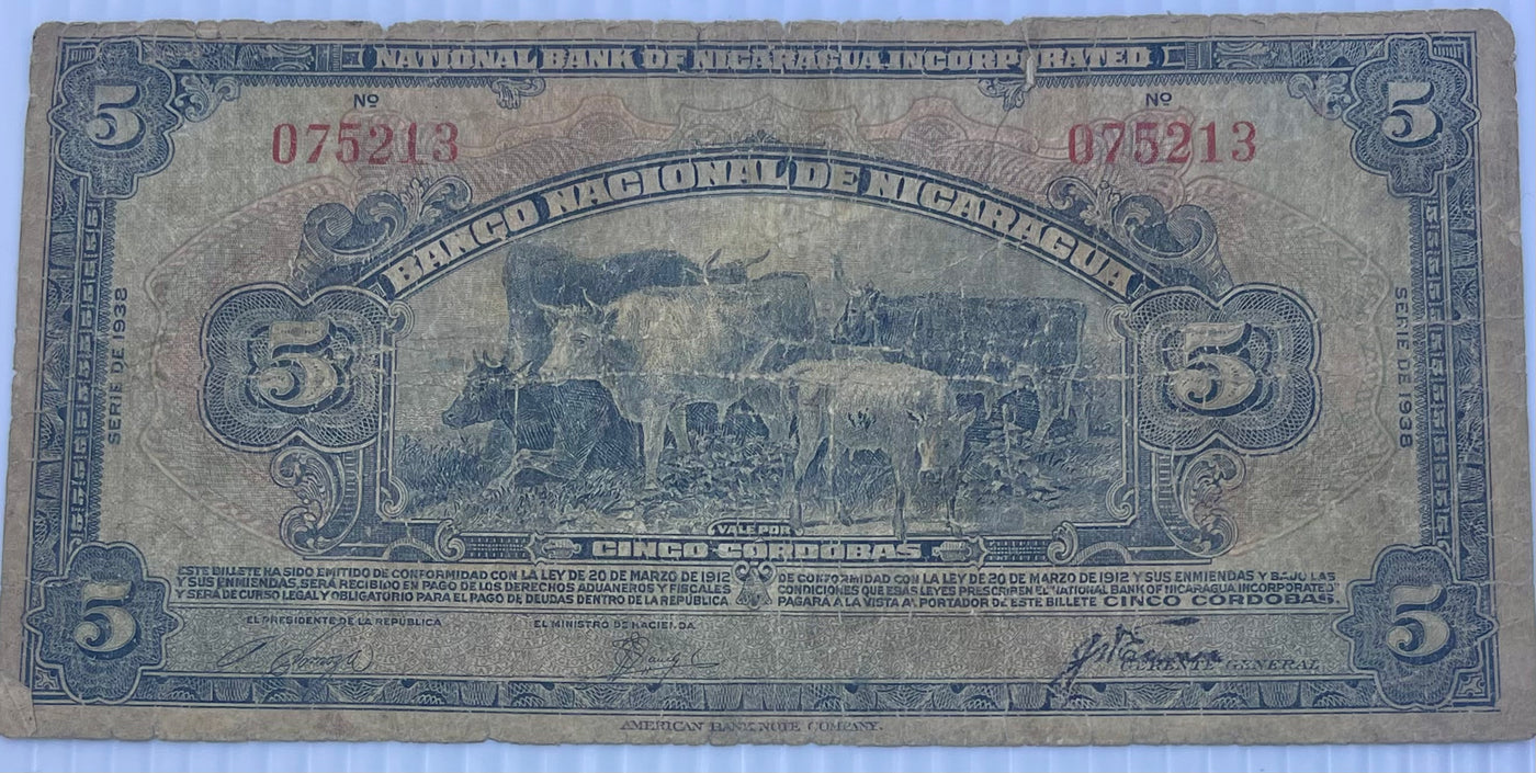 Nicaragua 1938 5 Cordobas P-93 Used World Banknote Currency