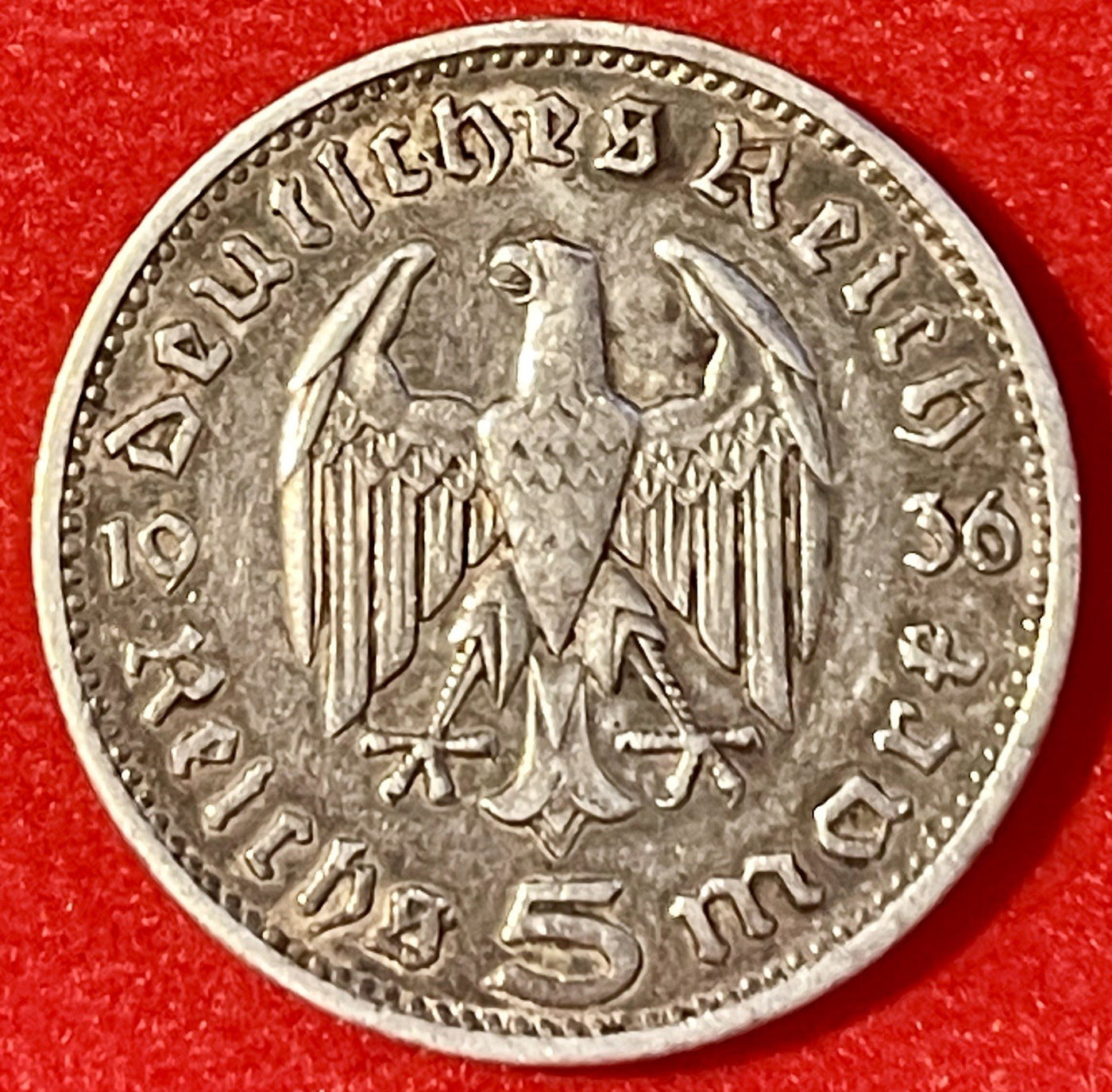 5 MARK 1936 G German WW2 90% Silver Coin Third Reich Reichsmark