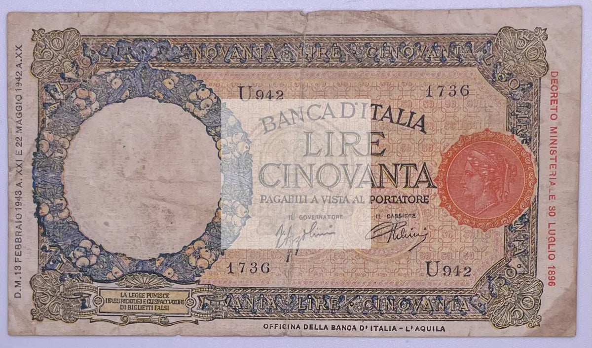 **Italy 1943 50 Lire Banknote - P-66 - Circulated**Add a significant piece of World War II-era history to your collection...