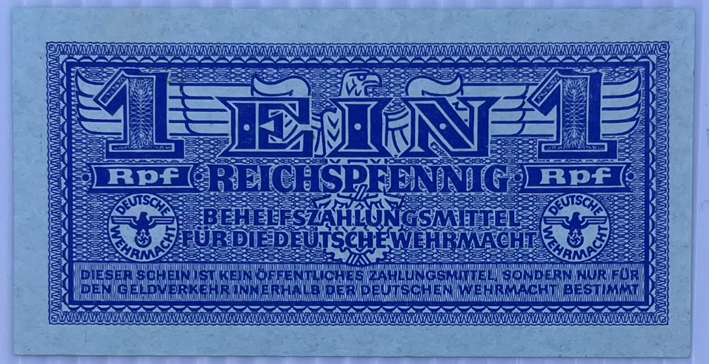 This banknote was designed for use in occupied territories and military operations, showcasing a minimalist yet functional design typical of wartime currency. It features crisp typography, traditional German iconography, and advanced anti-counterfeiting measures for its time.