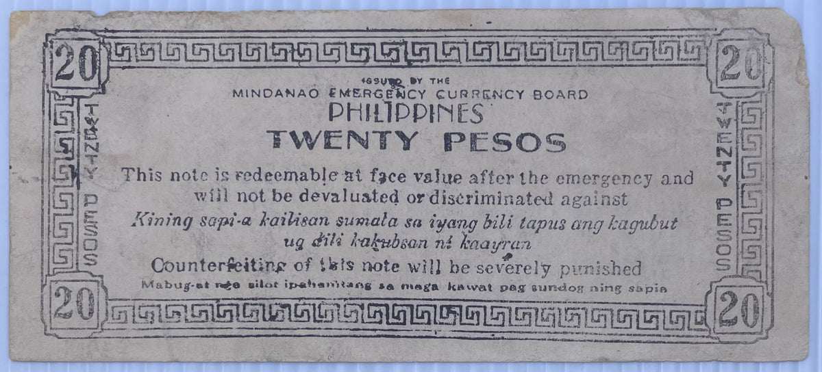 1944 Philippines 20 Pesos Mindano Emergency Currency P-S528D WW2 Circulated World Banknote