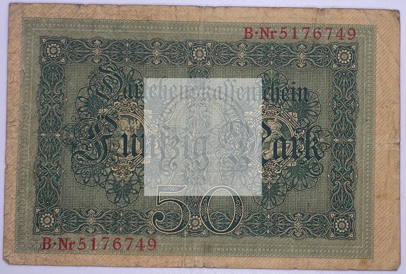 2. **Denomination and Value**: With a denomination of 50 Mark, this banknote represented a significant monetary unit in Germany at the time, reflecting its pre-World War I currency system.